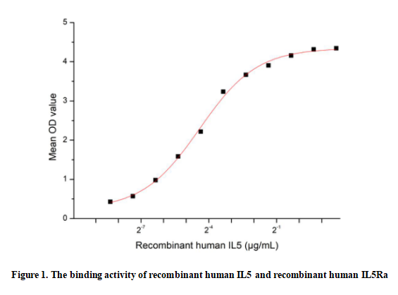 Interleukin 5 (IL5) is a T cell-derived cytokine crucial for eosinophil growth, differentiation, and activation, playing key roles in allergic inflammation and parasite defense. This homodimeric glycoprotein signals through the interleukin 5 receptor complex, composed of IL5Ra (CD125) and common beta chain (CD131). IL5 specifically binds IL5Ra with high affinity , initiating JAK/STAT signaling pathways that promote eosinophil survival and function.To detect the activity of recombinant IL5, a functional ELISA assay was performed to evaluate the interaction between recombinant human IL5 and recombinant human IL5.Briefly, IL5 was diluted serially in PBS with 0.01% BSA (pH 7.4). Duplicate samples of 100 μl were then transferred to IL5Ra-coated microtiter wells and incubated for 1h at 37℃. Wells were washed with PBST and incubated for 1h with anti-IL5 pAb, then aspirated and washed 3 times. After incubation with HRP labelled secondary antibody for 1h at 37℃, wells were aspirated and washed 5 times. With the addition of substrate solution, wells were incubated 15-25 minutes at 37℃. Finally, add 50 μL stop solution to the wells and read at 450/630nm immediately. The binding activity of recombinant human IL5 and recombinant human IL5Ra was shown in Figure 1, the EC50?for this effect is 0.047μg/mL.